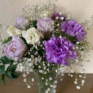 職場のお花 かすみ草とトルコ桔梗✨🤍✨ 壁が白なのでパッとしませんが、 実物は華やかでとても綺麗です。 香りも👍です。