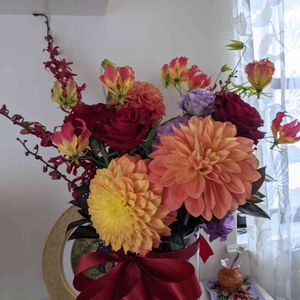 先輩への毎年の感謝の花束💐 大きなダリア、トルコ桔梗、 今日のお花🌼グロリオサも入ってました😆 代表の方がお花屋さんに依頼して下さるので、贈呈の日に初めて知ることになります😅 今🏷️を追加しました ダリアばユーミンが一番好きな🌼だそうです。レコーディングがうまく行かず、落ち込んでいたユーミンにタリア🏵️を松任谷正隆氏がプレゼント🎁して、交際が始まったそうです😉