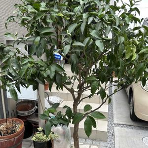 ご近所から大きな木🌲「シークワーサー」をプレゼント🎁されました。 玄関前🚪に設置しました。 小さな鉢はベランダで育ててみます。
