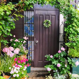 玄関前の植物達🪴 鉢植えのツル薔薇3鉢で枝を誘引したアーチは毎朝葉の裏にホースで水をかけて葉ダニ対策してます🌿 薔薇桜霞と紫陽花綾音の薄いピンクがお気に入りです