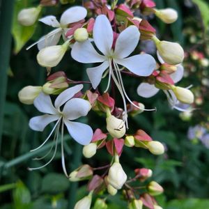 *クラリンドウ* 今朝の庭、クラリンドウの白いお花が咲き出しました。 4️⃣枚目、折れた枝を水にさしていたのが根を出しそうです。