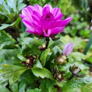 *ダリア* 見切り品でお迎えしてた、黒葉ダリア(ミスティクノワールライトパープル)が咲き出しました。 実際はもう少しダークな色合いです。 暑い中頑張っています。 🏷️金曜日の蕾たちに