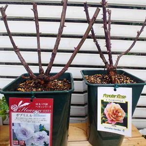 バラの新苗 昨日、ガブリエルを迎えました。以前に育てたことがありますが、当時の私は、バラに関してはまだ初心者で、難易度が高すぎたのでしょう。3年くらいで⭐になっちゃいました。 今回の苗は、ガブリエルにしては、太く充実した枝ぶりです。上手に育てられるといいなぁ✨ 右は年末に自分へのお誕生日プレゼントとして迎えたディスタンスドラムズです。これもガブリエルと同じような状況だったので、今年はうまく咲いてくれると嬉しいなぁ💕