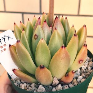 葉先がピンクになる子はいくつもあるようだけどこの子は誰なんだろう🤔 葉の形で検索したら Echeveria agavoides 'Red Tip'か'Saggita'というのが似ているけれど **更新** 日本名では桜吹雪🌸 素敵な名前でワクワクです😆 回答下さった方ありがとうございました😊
