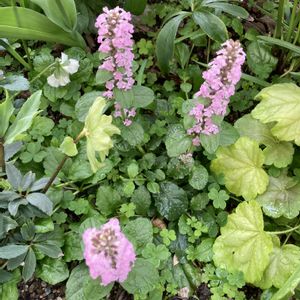 ピンクのアジュガ。 何年か前にお隣のお家から分けてもらったもの。少し紫がかった優しいピンクが可愛いです。葉は赤みがある感じ。 もう一種類少し花色が違うピンクのアジュガが我が家にはあったのだけど、枯らしてしまって💦 家からお隣のお家に株分けしていたので、お隣の方からそれをまた株分けしてもらい里帰りしてまいりました😭💓ありがたい!もう枯らさないようにしよう!