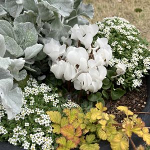 🌸ガーデンシクラメンの寄せ植え🌸 調べてみると、ガーデンシクラメンは霜が当たっても大丈夫、という意見と、霜が当たるところはダメ、という意見とあります 実験的に、秋に買ったガーデンシクラメンを完全に霜が当たるところに(ちなみに雪も降りました❄️)一冬置いてみました 結果、冬の間は花が小さく傷んだ感じで、縮こまった様子 しかし、春になったらこんな感じに美しくなりました✨ 一緒に植えたアリッサムもモリモリ🌳 黄色い葉っぱは名前忘れちゃいました ちょっとトゲがありますが、可愛らしくて気に入ってます💕 4枚目は昨夜の夜桜見物🌸 下にずらすと人人人 なので夜空と共に