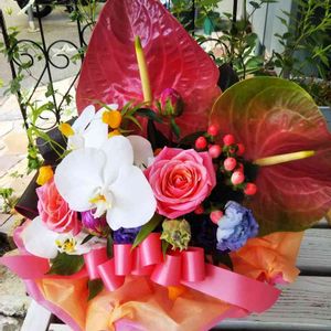 アンスリウムを使った夏のアレンジメント。 と、いうと聞こえはいいが 単に売れ残りそうな花の廃棄回避アレンジメント(正解) 結局、売れなかったので持ちかえり😩