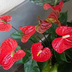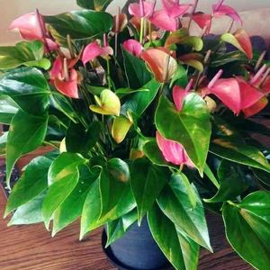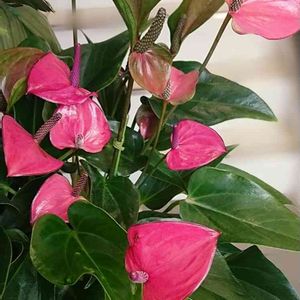 アンスリューム。 綺麗なパープルピンクです。もりもりです。 花の色を少しでも長く楽しむコツは日光浴だそうです。 霧吹きシャワーも大好きな美人さん達です。