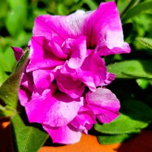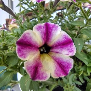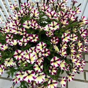 PWスーパーチュニアラズベリーチーズ、ほぼ満開かな☺️暴れやすい子ですが、わりと密になってくれました❣️ 葉っぱもイキイキしてるし、本当に強い❣️ あと何回かは満開見せてくれそう☺️