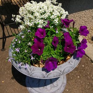 北海道、暑いです🌱 夏の寄せ植えの鉢、ペイントしました。青いペチュニアはスーパーチュニアのベルベットだったかな。花弁がお洒落です。ユーフォルビアダイヤモンドスノーとロベリア、全てPWのものです。