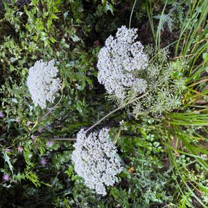 ノラニンジンも街中でたくさん見かけました。 北海道ブルーリストにも載っている、困ったちゃんのヨーロッパ原産の帰化植物です。 ※絶滅危惧種の「レッドリスト」の逆と言う意味で「ブルーリスト」と言うのだそうです。 ノラニンジン セリ科 ニンジン属 中心に濃い紫の花弁がひとつあるのが特徴で、なぜ色のついた花弁がひとつだけあるのか、理由は不明で諸説あるが、「虫をおびきよせるため」という説が有力。 でも無い子もいます。 ニンジンの葉に似た羽状複葉(葉軸を中心に小さな葉が両側につく形状)で、細かく切れ込みが入った羽のような形の葉っぱをしています。 🏷️悩ましいセリ科