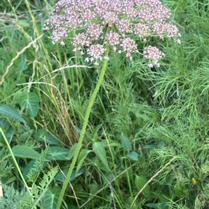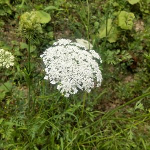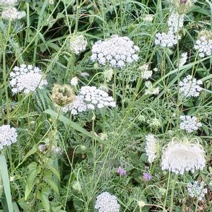 ノラニンジン(野良人参) セリ科ニンジン属 昭和の初期に牧野富太郎博士によって見出され、現在では日本全土で見られる。特に北海道では普通に見られる。 レースフラワーと似ていますが、レースフラワーの花の色は白のみで、花と花との間隔が空いているのが特徴です。 ニンジン自体に毒性成分はないとされています。ただし、ドクニンジンという非常に有毒な植物が存在し、ノラニンジンと間違われる可能性があるため注意が必要です。ドクニンジンは、根、茎、花、種子、葉の全てに毒性があり、コニインやガンマ-コニセインなどのアルカロイドを含みます。 ドクニンジンを誤食した場合、悪心、嘔吐、流涎、昏睡といった症状を引き起こす可能性があり、場合によっては呼吸麻痺による死亡に至る可能性も指摘されています。ドクニンジンとノラニンジンを見分けるひとつの目安は、ドクニンジンの茎に紫紅色の斑点があることです。ただし、これが判別できない場合、食用にするべきではありません。 (ネットより)