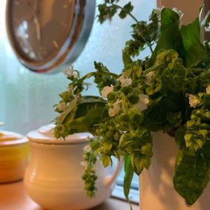 今朝はかなりの強風、豪雨。 朝散歩は行けなかった-。 庭のバジルの花をカットして台所に挿してます。 小さな花と香りが好き〜♬