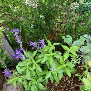 もう一つ 日向よりの鉢植えの フウチソウ✨ 草取りさぼりがちな梅雨時😁 後ろで咲いてるのは 冬の寄せ植えの ガーデンシクラメン😵 こんな季節から咲いてて大丈夫? 狂い咲きですかね~😓