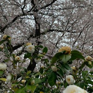 朝散歩 10℃ くもり小雨〜雨 暖かい朝ですが空が暗いです。 でも出かけました♪ 咲かないで終わるのかと思っていた。 椿が咲いていました。 SAKURAとCamelliaのコラボ。