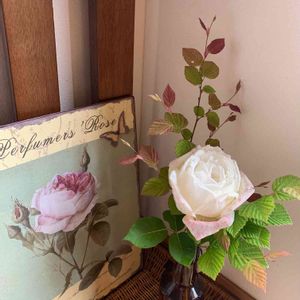 小さな庭より。 ミニ薔薇以外の唯一咲いていた一輪の薔薇さん。 雨が酷くなる前にカットしました。 自分の小さな庭から薔薇をカットして、 部屋に飾ることはあまりありません。 だって花が少ない小さな庭だからです。 でも花友さんのアドバイスで 強い雨の前にカットしてさして見ました〜* 薔薇のプレートと少し雰囲気似てません?