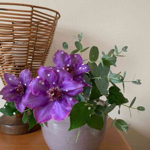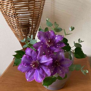 小さな庭より。水玉クレマチス① こんなクレマチス見た事あります?笑 2pic投稿します。どちらが良いですか。 ユ-カリは本当出番が多い、大好きな植物。