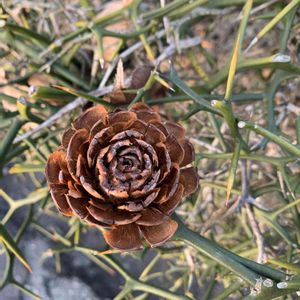 朝散歩 1℃ 晴れ いつも見かけるトゲトゲのみどり。 初めて見ました。渋めの花は松ぼっくり笑 落ちて乗っているだけかと思いましたが しっかり付いている。 雪に隠れて知らなかった事。 🏷花ブロ-チ倶楽部 渋めのブローチ笑