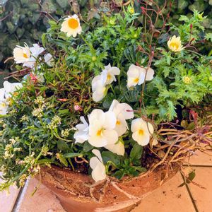 小さな庭の寄せ植え。 ナチュラル風に〜10日ほど前。 今年の春は白、ホワイトにしたいと そんな花を選んで寄せ植えしました。 向きが正面がずれてました-。 羽衣ジャスミン ノ-スポール ビオラ シボリカタバミ アイビー
