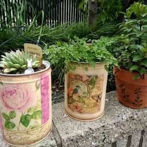 ミルク缶にデコパージュして、左側は多肉を真ん中はハーブ・チャービル入れました🌱 右側はキャンディーミントです🌱
