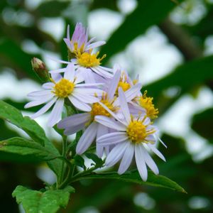 今日、小雨の時に撮った 汚庭の可憐な * ノコンギク * 紫色なのに?写らない📱😂 鉢植えの軒下の方は葉が虫食い でも咲く強い花 💪 咲き進むと花弁が白く 細長になってます 🙏訂正します 色違い?2種類だったようです🙇🏼♀️ 11月9日