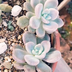 ➡️実生 ⬅️その葉挿し ずっと元気がないので葉挿しでスペア準備しなきゃ! で葉っぱとって葉挿しした まさか三ヶ月くらいでオリジナルのサイズを上回った 用土と世話も同じなのに 解せぬ!(°Д°) でもこれで絶滅危惧交配種じゃなくなった やった!