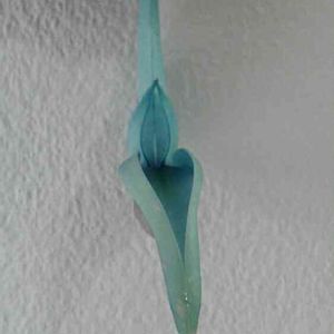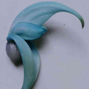 で、ヒスイカズラの花はこんな風になっていて、この画像の上の部分の中に雄しべと雌しべが入っているわけですが、いかんせんそれらがここの筒状になっている部分にあるので目立たず、一般の昆虫じゃ辿り着けないし、雌しべの柱頭に保護膜があるそうなので、それを指でこすって破ってから受粉させるのだそうです。 だけどどのくらいの加減でやればいいのだろう??