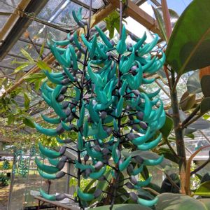 🩵ヒスイカズラ祭り🩵 1歳半のお孫ちゃん連れて市川植物園のバラ園へ行きました🌹 バラ園を見学した後、奥にある市川鑑賞植物園に電話して、翡翠蔓を確認したら咲いていますとの事❣️ 足を伸ばして見て来ました😊 蔦なので温室天井近くまで成長しています。 5枚目の花弁は受付にて「朝落ちていたのでご自由にどうぞ」と言われたので3枚持ち帰りました🎶 目を引く👀綺麗なブルーでした🩵 まだ蕾があったのでもう暫く楽しめそうですよ😊