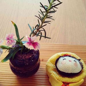 最近行ったカフェにて 撫子とローズマリー あとかわいいお雛様。