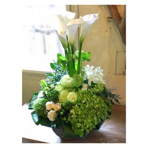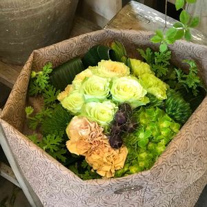 おはようございます😊 大人っぽいアレンジメント。 、 娘さんからお母様の誕生日に😊お母様からいつもネットで当店にご注文頂いているらしく☺️ 、 人にうちのアレンジメントはよく贈るけれど、自分は貰った事が無いのでは❓ との事で娘さんにご注文頂きました🤗 誕生日にはお花しか受け取らないという程のお花好きなお母様らしく☺️ いつもはカラーとユリをプレゼントししていたそう😗 、 お母様のお名前をお聞きして、過去のご注文を調べてみたらお好みが何となくわかりましたのでこんな感じになりました🤗 、 お母様のためにちょっと離れた当店までご来店頂きありがとうございました🤗