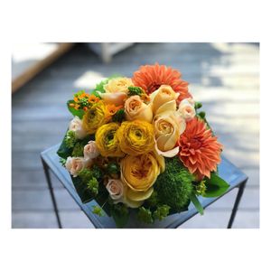 おはようございます☀ 、 イエローオレンジ系でお任せ😙 アクセントにダリアを入れて😊