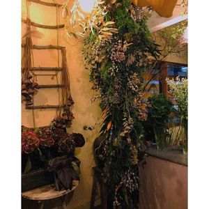 こんばんは 、 今日は逆さツリー? 巨大なスワッグ? オブジェ?を作ってみました😙 、 2.5mのユーカリ5本を元にヒムロスギ、コニファー、ドライのユーカリ数種、アジサイ、雲竜柳、リューカデンドロ、のドライをフレッシュに混ぜて作りました☺️ 、 ドライになって行く過程をしばらく楽しめそうです😁👌