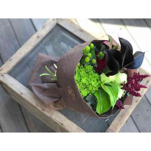 いつもインスタグラムをご覧頂いている方からのご注文でした🤗 、 結婚記念日のお祝いに、渋めのカッコイイ感じのブーケをと言うご依頼でした😙 、 ブラックのカラーにグリーンを多めに使い、ダークレッドと紫をアクセントに入れて渋めに👍 、 意外にグリーンのアンティークアンスの存在感が良い感じになりました🤗 、 T様ご注文頂きましてありがとうございました😊