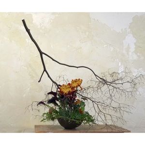 今日のレッスン生徒さんの作品。 、 ドウダンツツジの枯れ枝を活かして と言うテーマで😙 、 枝を逆さまに使い流れをとても上手く活かす事が出来たと思います🤗 素晴らしい😙👍