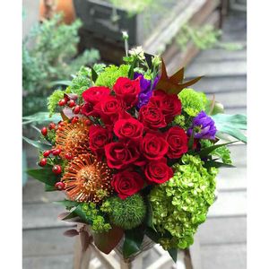 誕生日のアレンジメント🤗 、 赤を入れて華やかにお任せ☺️ 多色使いでもグリーンを豊富に使えば美しく見えます🤗 、 昔しはグリーンを沢山使うと緑ばっかり、もっと花を入れて😗 とか言われましたが、最近はグリーンを入れて下さいと言われるようになりました🤗