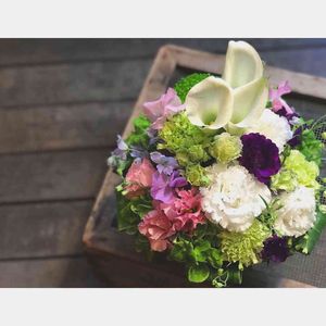 おはようございます☀ 、 今日はすっきりと晴れて暖かくなりそうな東京です。 、 最近インスタグラムを見てとか、グリーンスナップを見てなど、お問い合わせやご注文が増えてきました。😊 、 いつもご覧頂いている皆様ありがとうございます。感謝感謝です🤗 、 お供えのアレンジメント。少し色を入れて😌