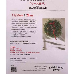 リースのワークショップが決まりました。11月25日と28日、千歳烏山駅前のライフスタイルショップ、スパークリングデイズにて。😊 、 各日定員8名となります☺️ 募集を開始しましたらまた告知させて頂きますね🤗