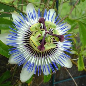 新潟県立植物園にて、初めましてでした🕓 キャーーーーッ!! こ、これが…∑(๑º口º๑)!! パッションフルーツ トケイソウ科 原産国:熱帯アメリカ 撮影場所:新潟県立植物園 撮影日:2022.06.29 パッションフラワーを日本では、トケイソウと呼んでいます。 パッションフルーツもトケイソウの仲間です。(トケイソウ科) 混同しやすいですが、いろいろな花の色があります。 一般に見られるトケイソウの色以外に、白、赤、青紫、緑などがあります。 トケイソウ科には種の数が約500あり、栽培品種が数多く出回っています。 トケイソウの花をよく見ると、3つの雌しべが時計の長針、短針、秒針のように見える、特徴のある花を咲かせることに由来します。 また、16世紀に中南米に派遣されたイエスズ会が、 パッションフラワーをアッシジの聖フランチェスコが夢に見たという 「十字架上の花」と信じ、キリスト教の布教に利用したそうです。 キリストの受難を象徴する形をしており、花の雌しべの柱を十字架、 3つに見える雌しべが釘、副花冠(雄しべ)は茨(いばら)の冠、 5枚の花びらと萼(がく)は合わせて10人の使徒、 巻きひげはムチ、葉は槍であるなどと言われていたそうです。 いろいろな想像があるものですね。