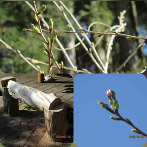 晴天に恵まれ桜の蕾が膨らんで来てます\(^-^)/ 丘の上の我が家は平地より気温が低いですが。 春は平等に来ていますね 庭に切り倒したマキの木ベンチが鎮座しています