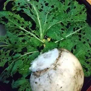 かぶ: 畑のかぶが大きくなってきました。 1つ抜いて見ました。 本当は大きなかぶのはずまだ少し小さいけど葉はたくさん美味しそう。