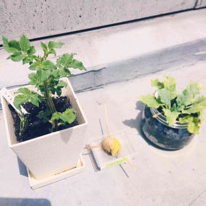 水耕栽培から植え替えしたジャガイモとカブ おジャガイモはすくすく カブは葉っぱが黄色い白い感じになってきて具合悪くなってしまいました 何が足りないのかな。 アボカドは芽が出そう。やや時間かかっているよ