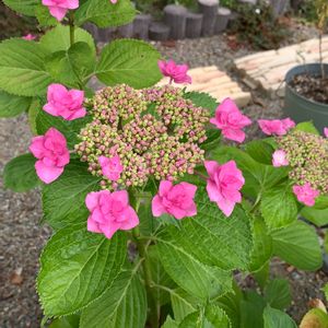 *小庭の 紫陽花祭り* 星の桜 #16🌿 桜の花びらを思わせるようなキュートなガク紫陽花🌸 花弁の縁に細かいギザギザが入って星が瞬くようにみえます° ✧ (*´ `*) ✧ ° ギッシリ密になってる両性花も綺麗です💞💓