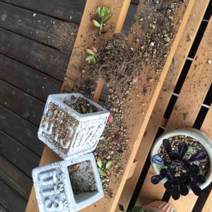 すんごい音がして慌ててウッドデッキに出たらラティス付きプランターが倒れて大惨事。 今日植え直した挿し芽ちゃん達も全部ひっくり返ってしまった…。 私が一体何したって言うんだ… 取り敢えず出来る限り元に戻してみたけど、土砂降り過ぎて断念。 疲れきって寝てた夫も手伝ってくれた😢 種蒔きしてた鉢も引っくり返っちゃた⤵️⤵️ 落ち込むよー… ナメクジに始まりこの有り様⤵️⤵️ みんなごめんよー( ;∀;)ウゥ…