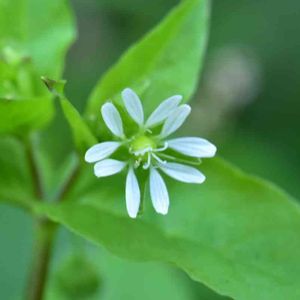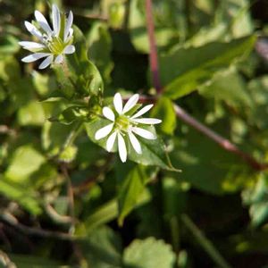 ウシハコベ 牛繁縷 花径0.7~1cmの小さな花。花弁は白色の5弁、2つに深く裂けるため10弁に見える。 雌しべが5本あるのはウシハコベ。 名前の由来 ハコベに似ていて、大型である事から牛に例えられた。