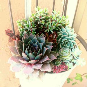 おはようございます😊 昨日作った寄せ植え✨ センペルビウムかな? 絶妙なグラデーションが お気に入り💓