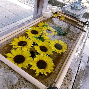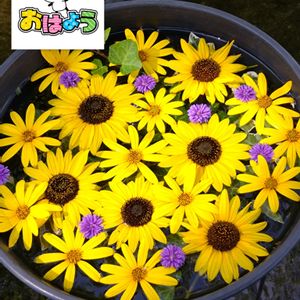 🌻向日葵🌻など 🏷️黄色い金曜日 参加します(*^^*) ハーブ園の池の中に 花手水で良いのでしょうか⁉️ 向日葵とオステオスペルマムか菊芋か⁉️ それと千日紅ではないと思いますが入っていました(*^^*) おはようございます(*^^*) 10月に入ってもまだまだ日中は夏日ですよ😭 真夏日はなくなってきていますがまだ暫く水分補給などしましょうね✋ 今日も無理せず頑張りましょうね\(^o^)/