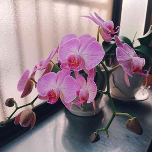 実家の胡蝶蘭 支柱無しでほぼ倒れて咲いてます😁 やはり蘭は水乾かしめがいいのかな?