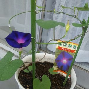 西洋朝顔グランパオット 咲きました‼️♥️実は2つ目です。最初のは蕾の巻きが強くて、うまく開かなかったので摘み取ってしまいました。思っていたより小型の花でした。ヘブンリーブルーの方が花は大きく成りますね。まだつるがさほどでもないのに、蕾付いてまーす‼️楽しみ‼️