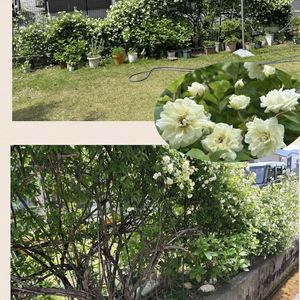 白花モッコウバラ‼️ 今年は見事に咲いてくれました♪ ほぼ扇🪭型だったけど、向かって左側に延長しました。 幅4.5メートル程に広げ、リビング、和室からの眺めも最高です♪ 1枚目は前側全景と、裏側から薔薇の立派な株の様子です。 真ん中に差し色のクレマチスも綺麗です。 2枚目は左側からのカット写真です? 3枚目は棘棘だらけのナニワイバラ そして、差し色でモッコウバラの引き立て役のクレマチス。 5枚目は昨夕、玄関先で羽化したツマグロヒョウモン蝶。 今朝は風知草に居なかったので無事に飛んで行った様です☺️