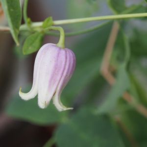 おはようございます。 ベランダで毎日咲いてくれている つぼ型クレマチスです。 この花は淡いピンク色でとっても愛らしいです。